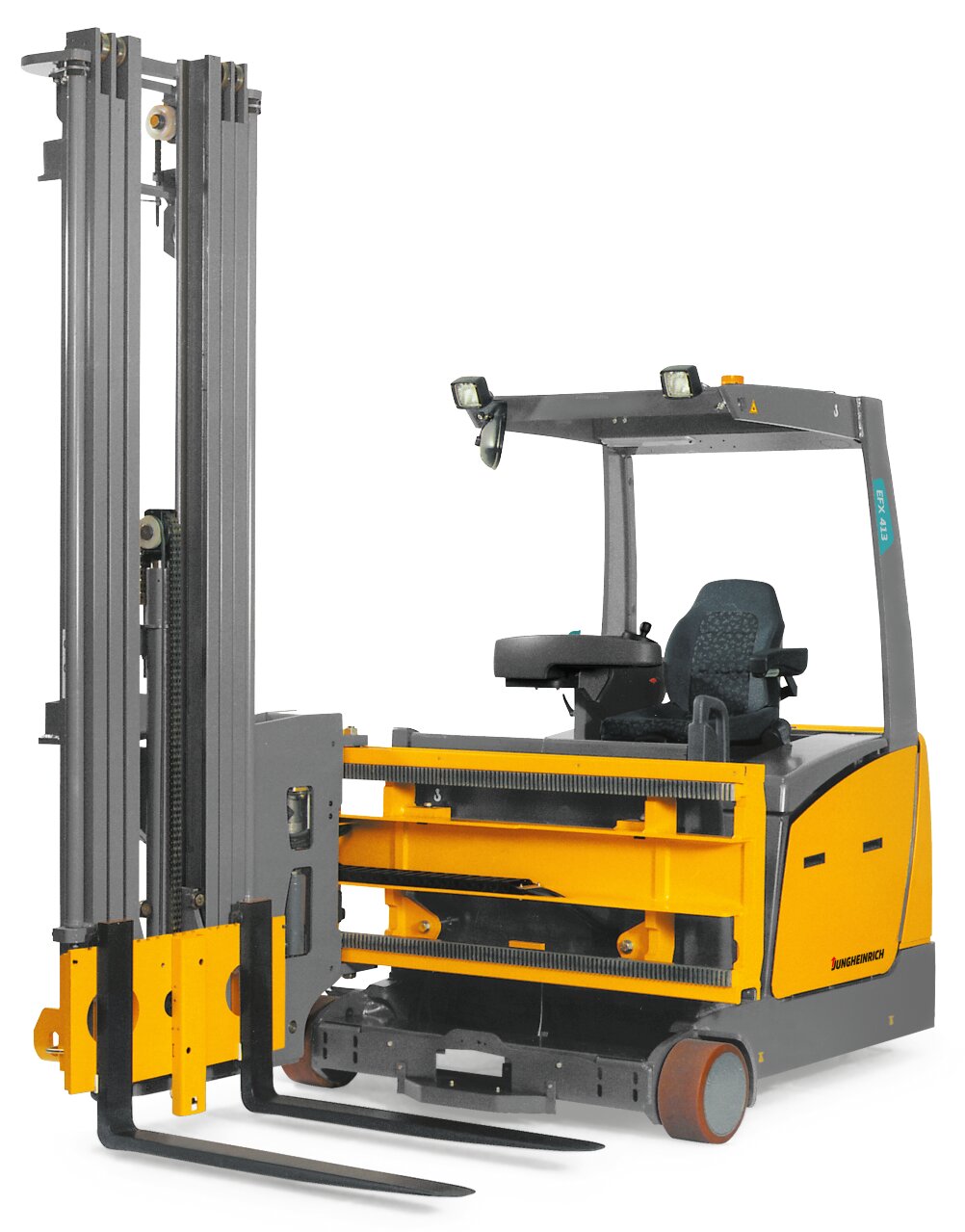 The versatile and innovative EFX 410-413 tri-lateral stackers are our specialists for combined use in narrow aisles, wide aisles and the apron area. The modular vehicle concept with front seat arrangement and side-mounted mast provides optimum visibility of forks, load and travel route. Work is done according to man-down principle where the fork moves up and the driver's platform stays on the ground. Standard and optional equipment options such as the integrated personnel protection system or RFID ground control ensure optimum speed profiles and high safety. Effective energy management with advanced 48- V AC technology delivers maximum throughput with low consumption. WarehouseNAVIGATION makes work easier and enables precise approaching and gentle positioning. The driver benefits from the intuitive operating concept with large-format display, adjustable control panel, spacious shelves and ergonomic controls.