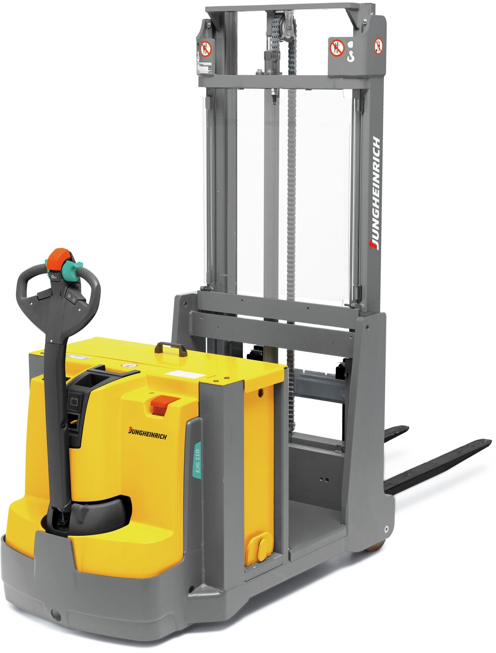 The robust and manoeuvrable EJG Series 1 pedestrian stacker can be used wherever special pallets, loading devices or special racking prevents the use of stackers with support arms. Its narrow width also enables it to be used in very confined spaces. Since it is a pedestrian-controlled model, frequent operator changes are fast and easy. The precise, speed-regulated hydraulic motor and the proportional hydraulics ensure that the load is moved gently and swiftly. Other contributions to safety are the long, low-mounted tiller and the crawl speed button, which allow for slow manoeuvring with an upright tiller.