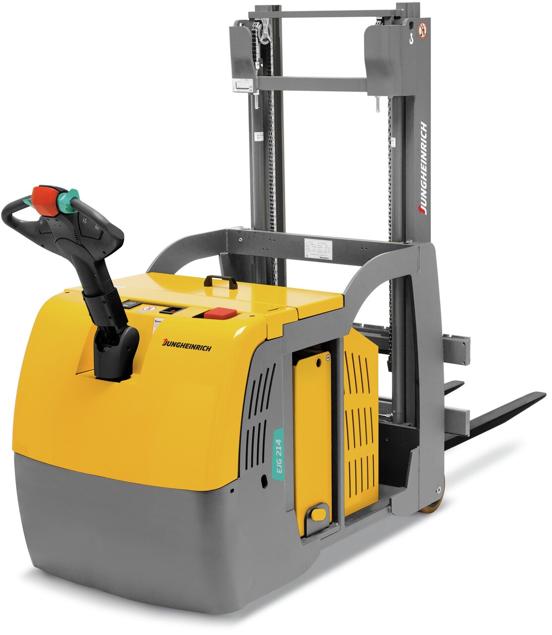 The powerful and ergonomic EJG Series 2 pedestrian stackers are designed as counterbalance trucks without support arms. That is the perfect prerequisite for use on racking with bumpers, or for the sideways lifting of pallets where the support arms would be obstructive. Due to the lack of support arms and the large load wheels, use on uneven ground poses no problems. As pedestrian controlled stackers they can be operated safely and efficiently and are therefore particularly suitable for use where there is a frequent change of operator. The necessary safety requirements are provided by the long tiller, while the electric steering allows for fatigue-free, ergonomic working. The finely tuned proportional hydraulics and the speed-regulated lift motor, allow for the particularly gentle and quiet stacking and transport of any material. This ensures particularly gentle load transportation.